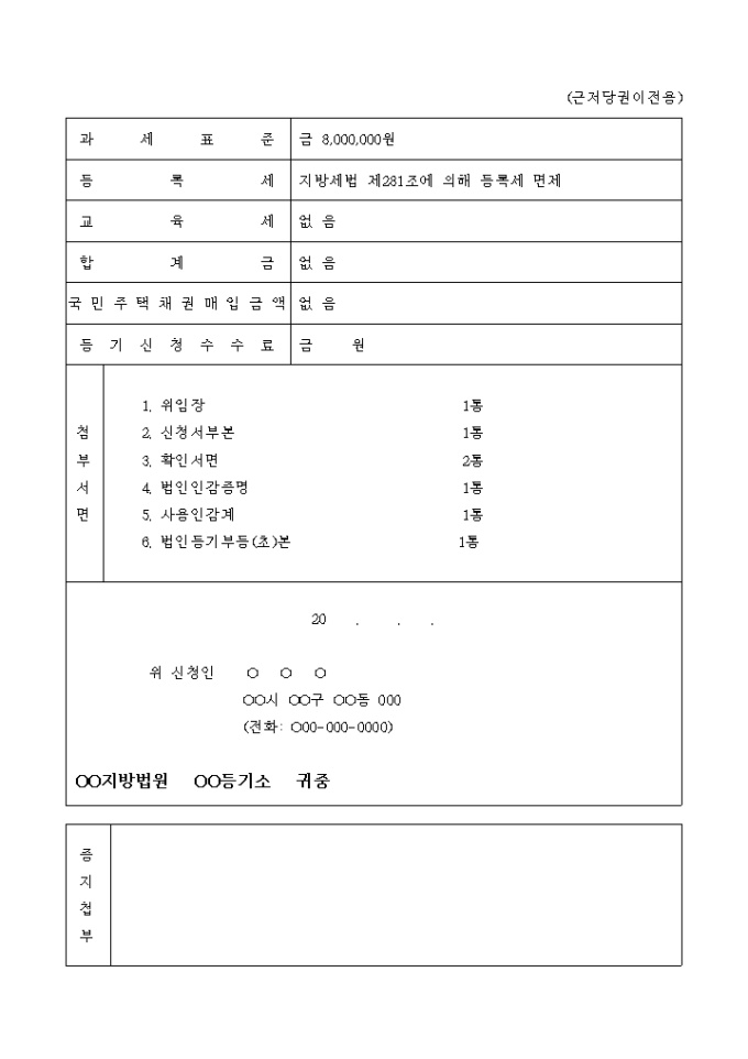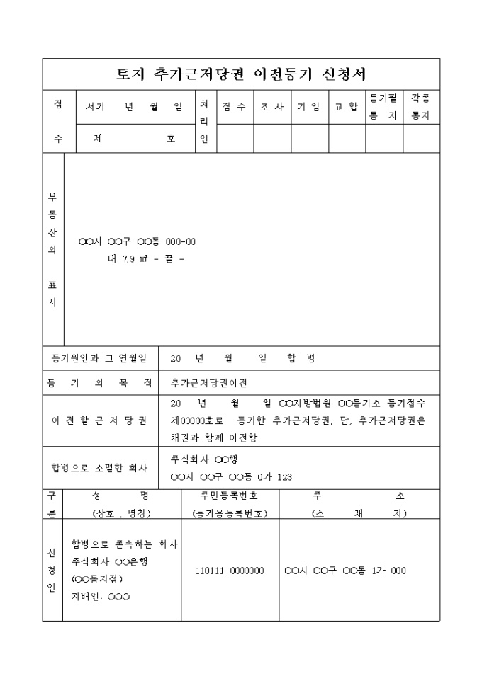 9,000원/월합병으로 인한 토지 추가근저당권 이전등기 신청서입니다.