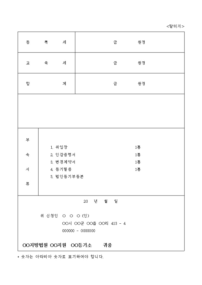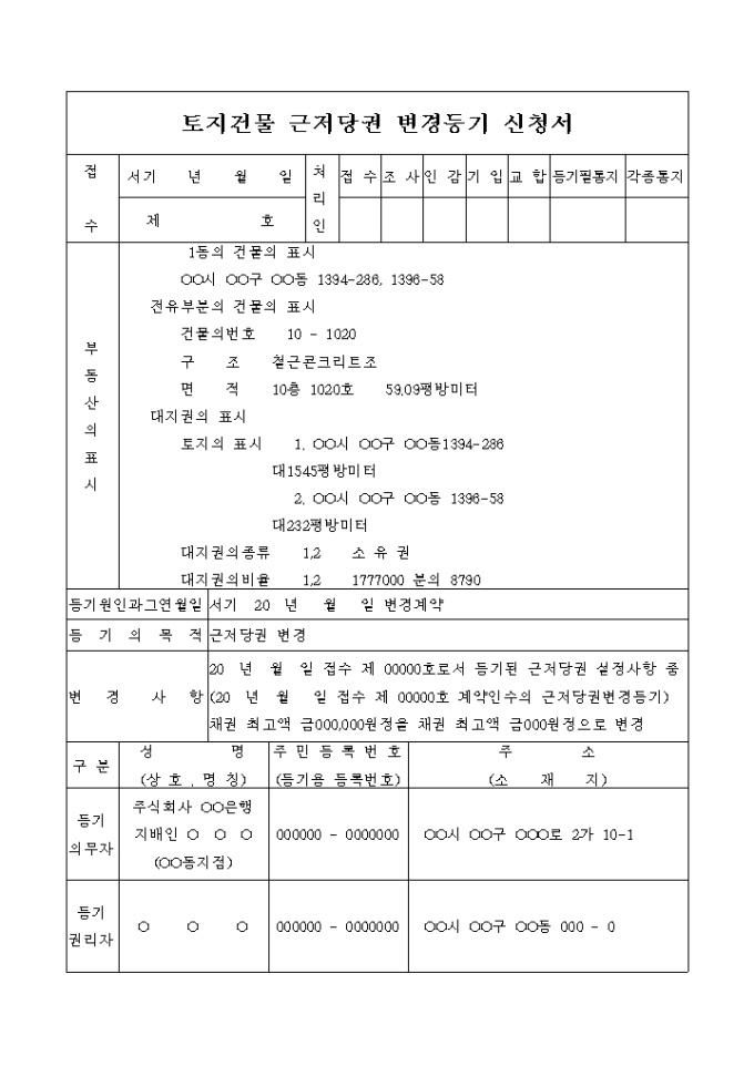 9,000원/월채권최고액의 변경으로 인한 토지건물 근저당권 변경등기 신청서입니다.