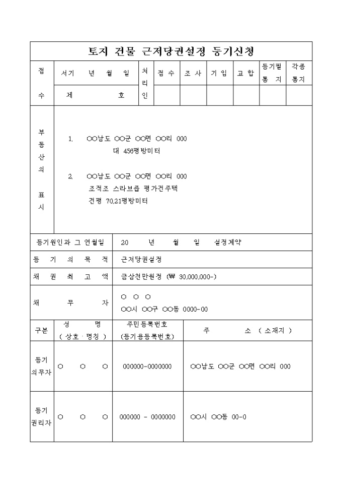 설정계약으로 인한 토지건물 근저당권 설정등기 신청서입니다.
