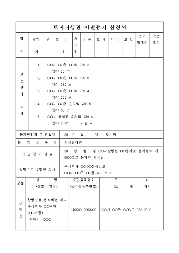 합병을 원인으로 하는 토지지상권 이전등기 신청서입니다.