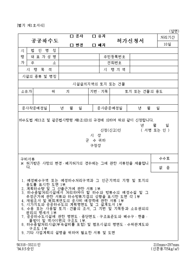 9,000원/월하수도법 제13조 및 같은법시행령 제8조의3의 규정에 의하여 위와 같이 신청할 때 사용하는 "공공하수도 (공사,변경,유지,폐지) 허가신청서" 양식입니다.