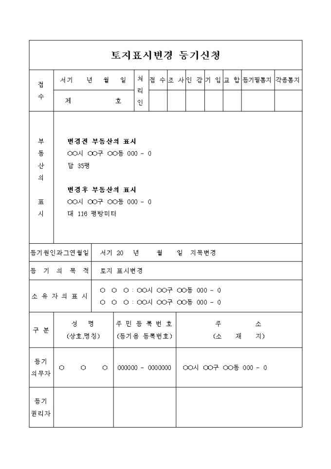 9,000원/월지목의 변경으로 인한 토지표시 변경등기 신청서입니다.