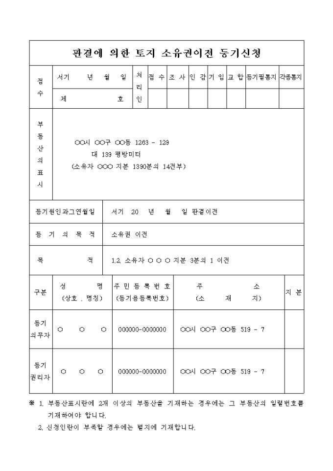 9,000원/월화해를 원인으로 하는 판결에 의한 토지 소유권이전 등기 신청서입니다.
