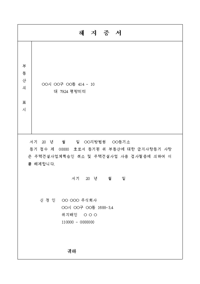 금지사항 등기를 원인으로 하는 해지증서입니다.