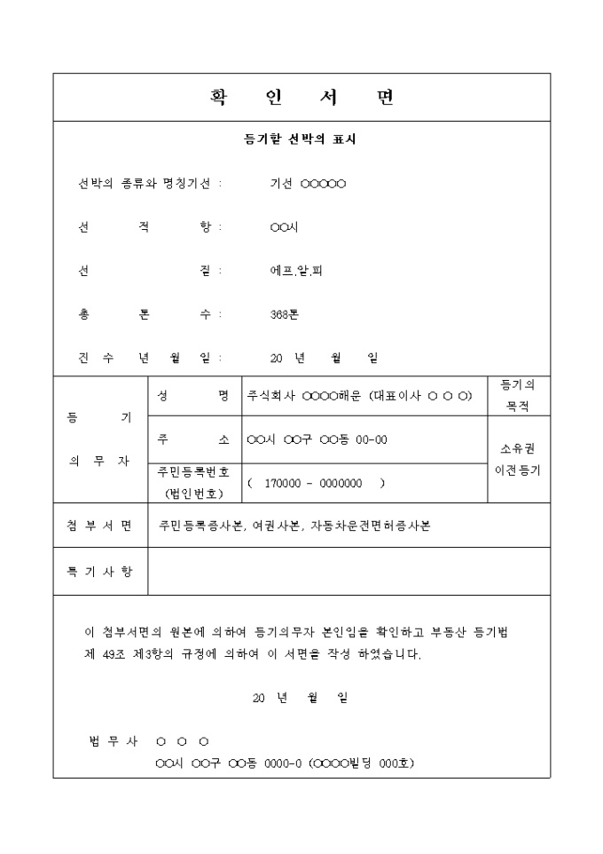 선박등기 소유권이전을 확인하는 확인서면입니다.