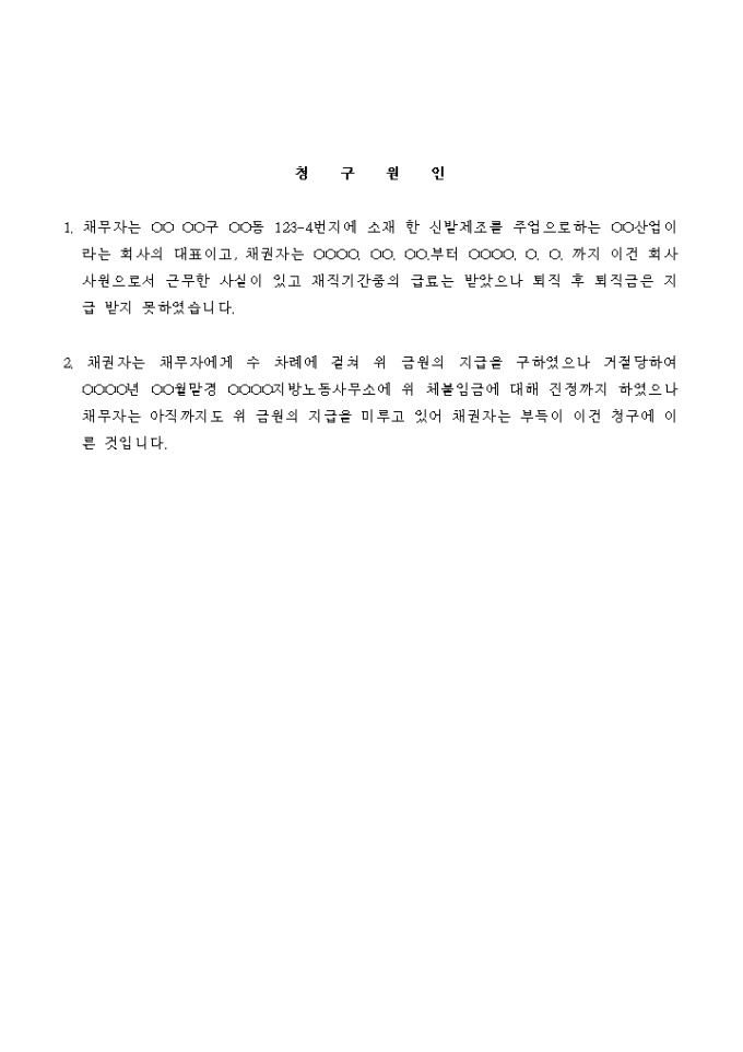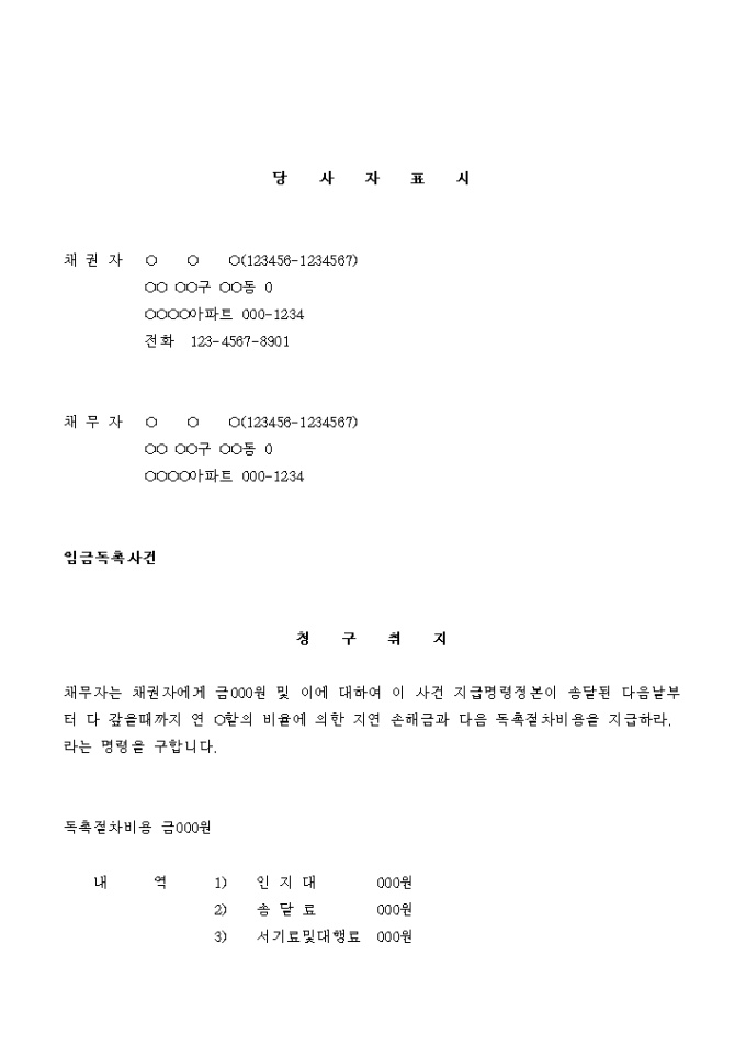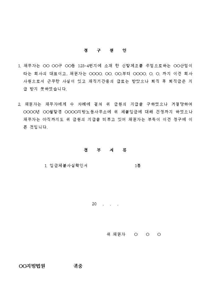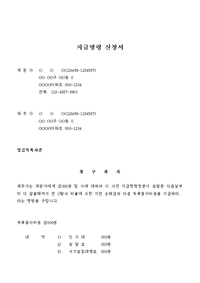 임금의 지급을 독촉하는 지급명령신청서입니다.