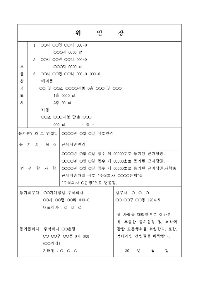 9,000원/월상호변경을 원인으로 하는 근저당권 변경등기 신청하는 권한을 위임할때 사용하는 위임장입니다.