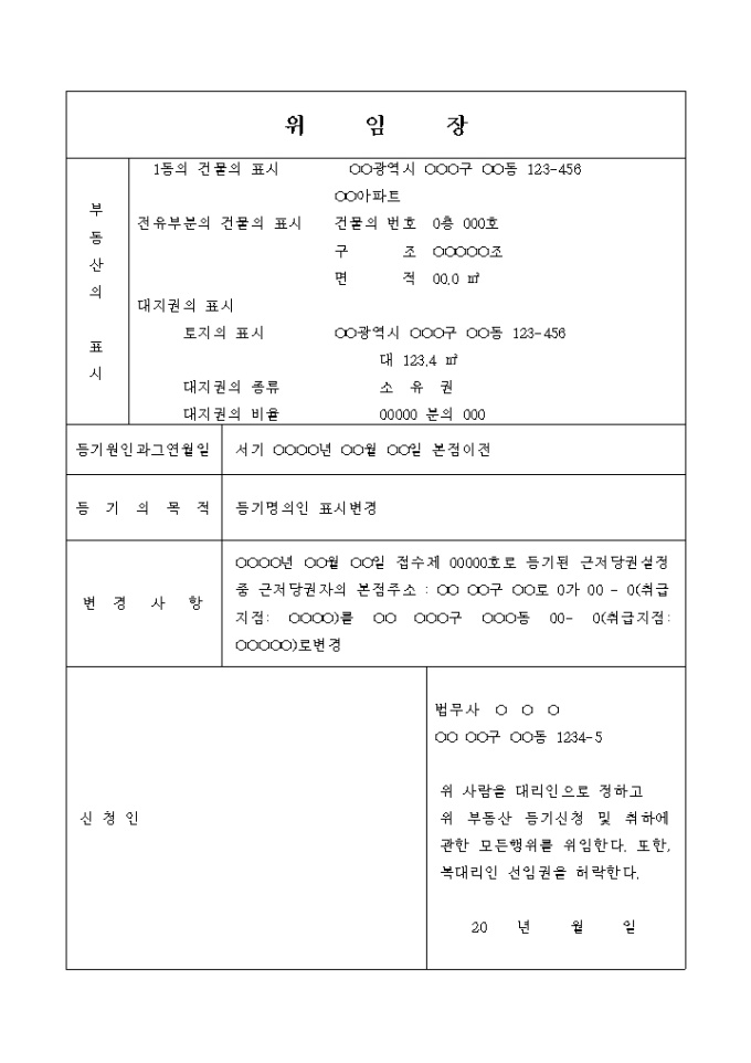 9,000원/월본점이전을 원인으로 하는 등기명의인의 표시변경 등기를 신청하는 일체의 권한을 위임하는 위임장입니다.