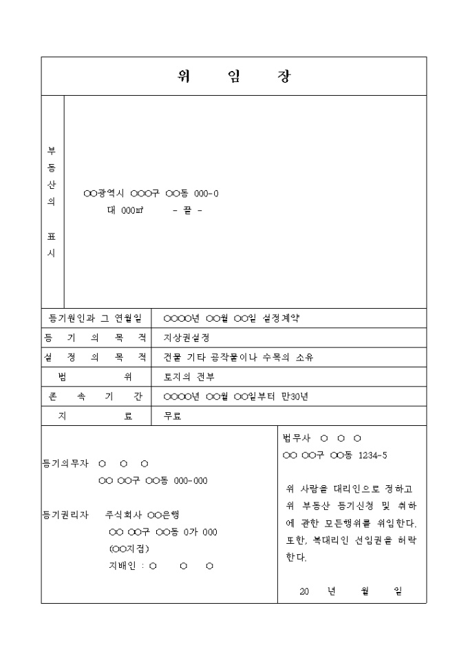 지상권설정 등기 신청 및 설정계약 위임장
