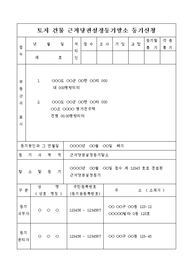9,000원/월해지를 원인으로 하는 토지 건물 근저당권설정등기말소 등기 신청서입니다.