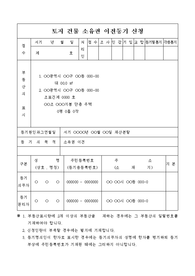 재산분할을 원인으로 하는 토지 건물 소유권 이전등기 신청서입니다.
