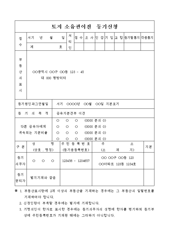 공유지분전부의 포기를 원인으로 하는 토지 공유지분 전부의 소유권이전 등기 신청서입니다.