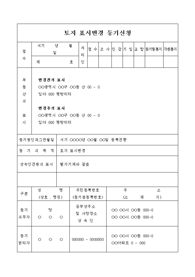 9,000원/월번지의 등록전환을 원인으로 하는 토지 표시변경 등기 신청서입니다.