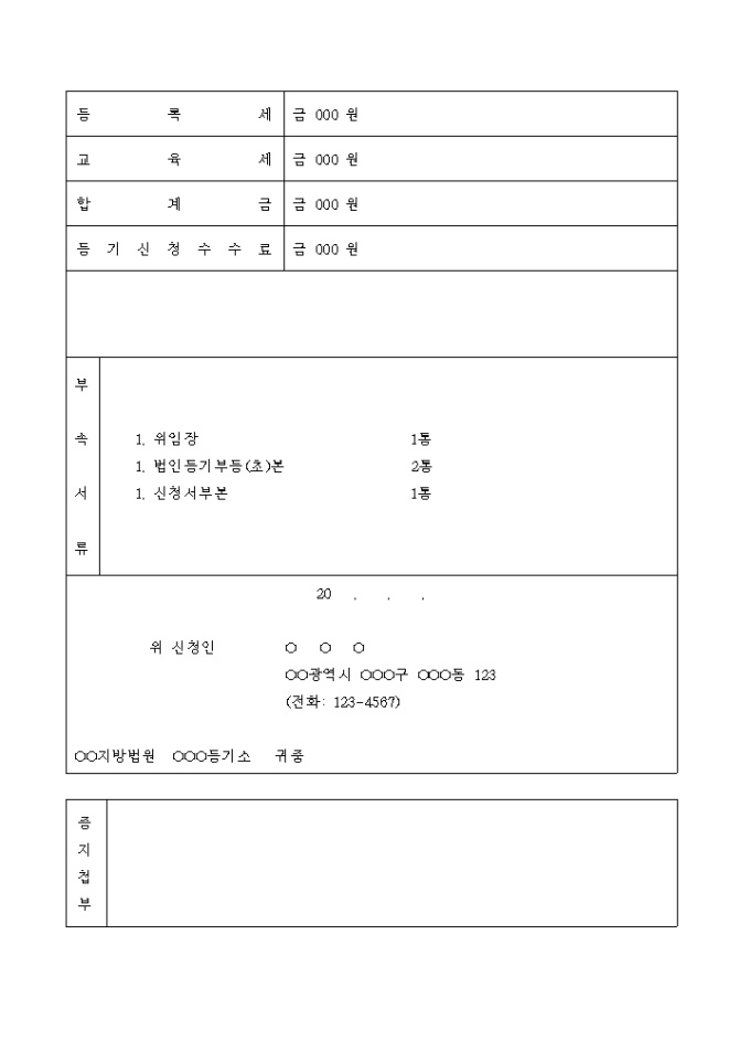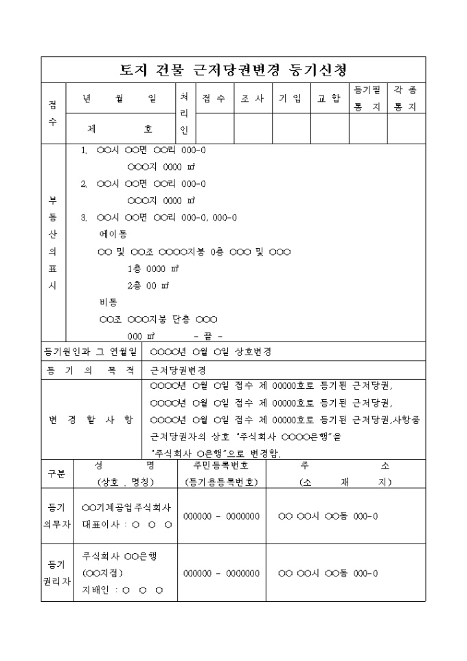 9,000원/월상호가 변경됨을 원인으로 하는 토지건물 근저당권 변경 등기 신청서입니다.
