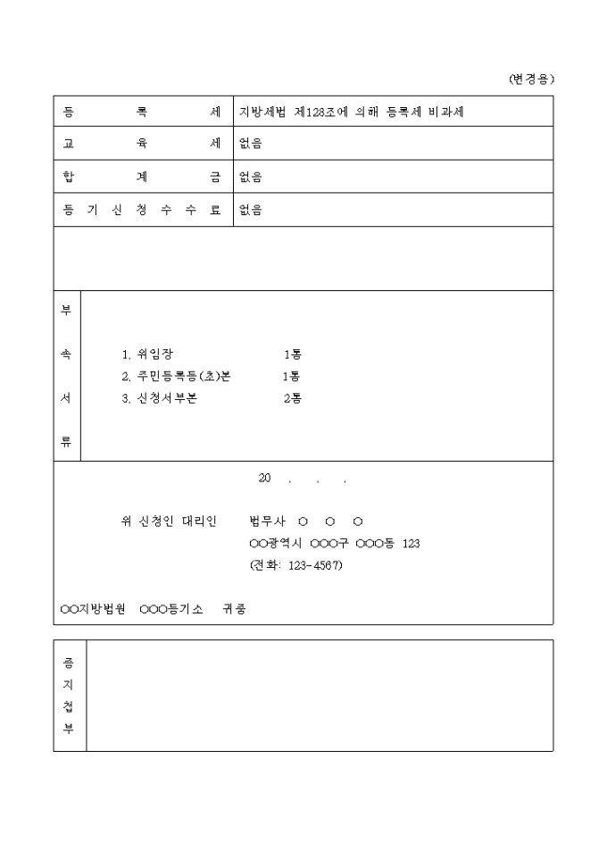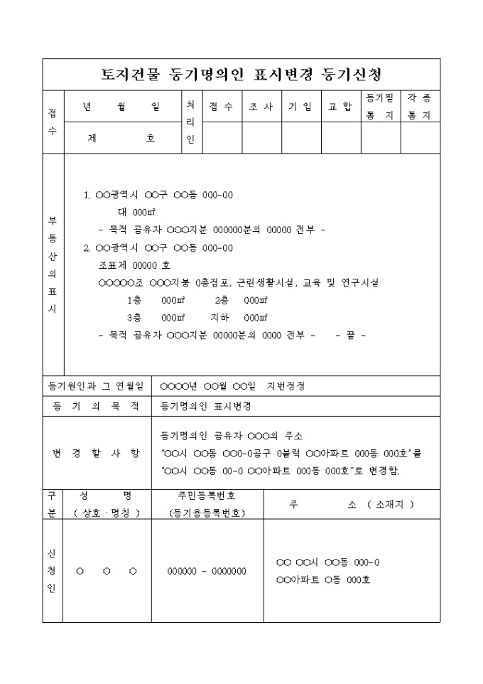 9,000원/월지방세 감면대상인 토지의 지번정정을 원인으로 하는 토지건물 등기명의인 표시변경 등기 신청서입니다.