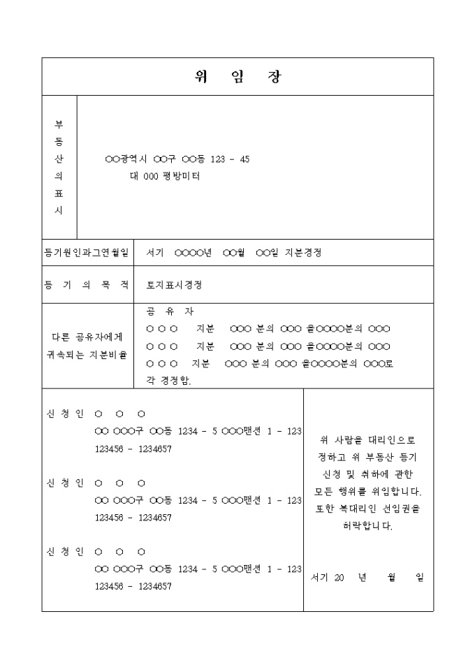 9,000원/월지분의 경정을 원인으로 하는 토지의 표시경정 등기을 신청하는 일체의 권한을 위임하는 위임장입니다.