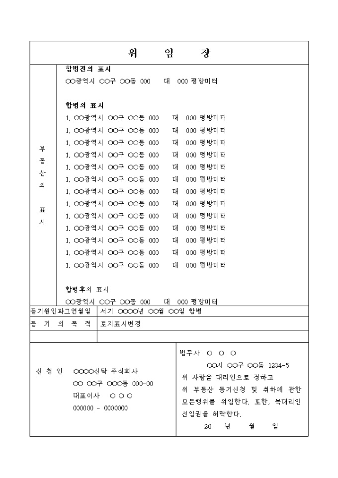 9,000원/월합병을 원인으로 하여,토지의 표시변경등기를 신청하는 일체의 권한을 위임한다는 내용의 위임자입니다.