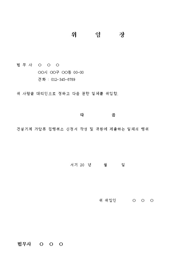9,000원/월건설기계 가압류집행 취소를 신청하는 일체의 권한을 위임하는 것을 내용으로 하는 위임장입니다.