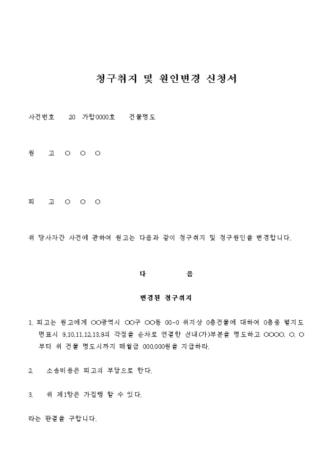 9,000원/월건물 명도청구소송의 청구취지 및 원인변경 신청서입니다.