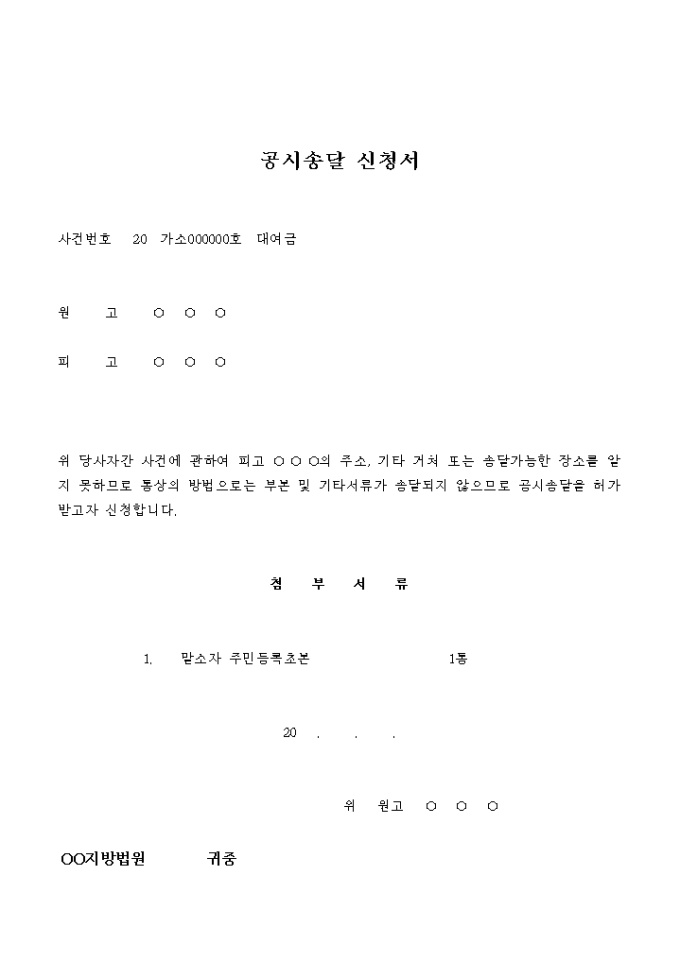 9,000원/월대여금 청구소송 피고이의 주소지를 알 수없어 공시송달을 신청하는 신청서입니다.