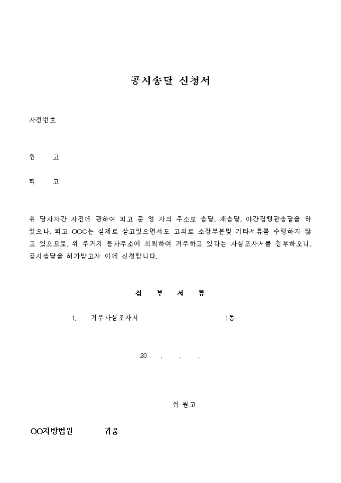 9,000원/월소장을 발송하였으나 피고의 주소지가 명확하지 않거나 바껴서 소장이 송달되지 않을 때 신청하는 공시송달 신청서입니다.