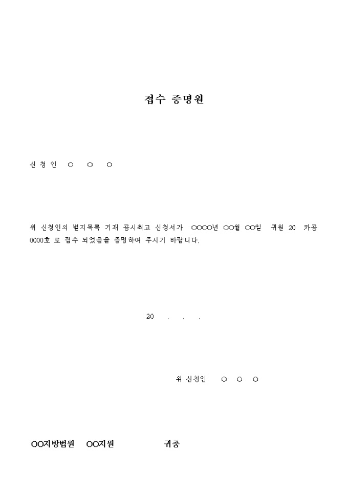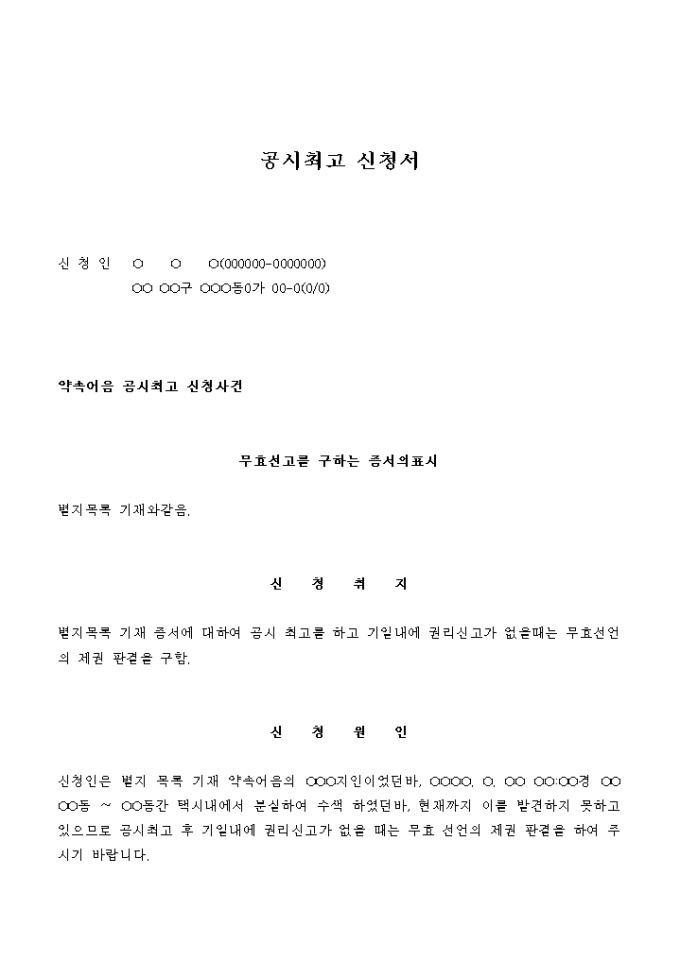 9,000원/월기재 증서에 대하여 공시 최고를 하고 기일내에 권리신고가 없을때는 무효선언의 제권 판결을 구하는 공시 최고 신청서 및 접수 증명원입니다.