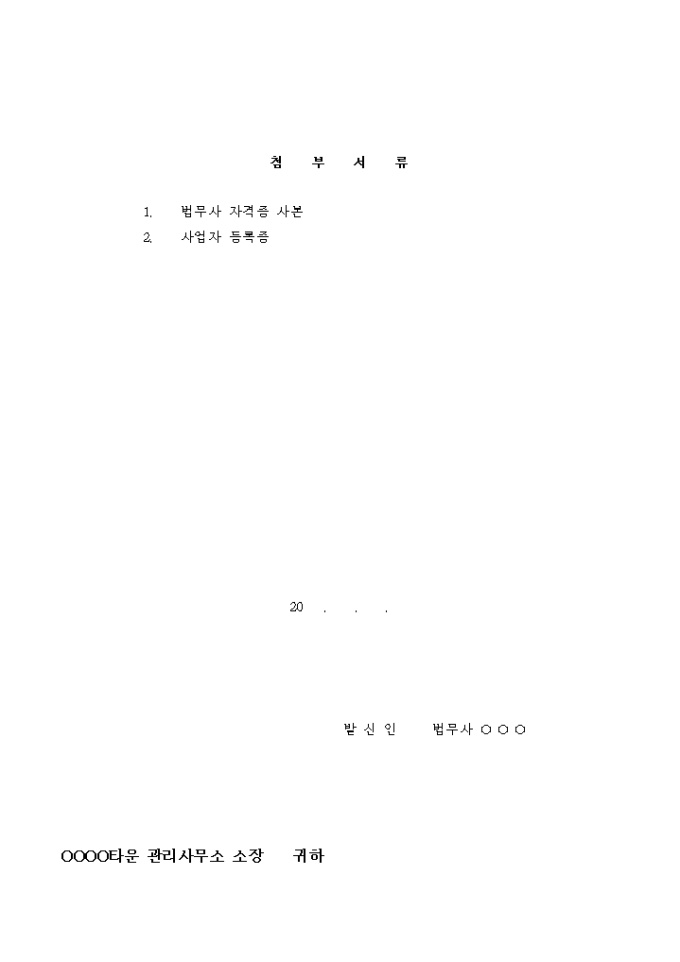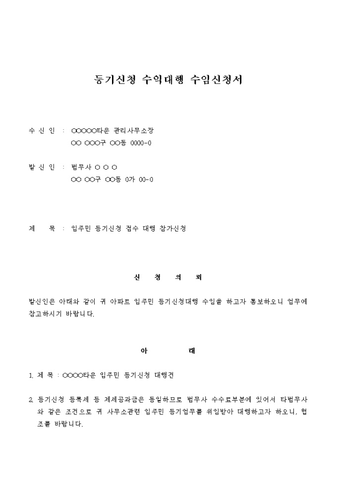 9,000원/월법무사가 아파트 입주민의 등기신청대행을 수임 하고자 보내는 신청서입니다.