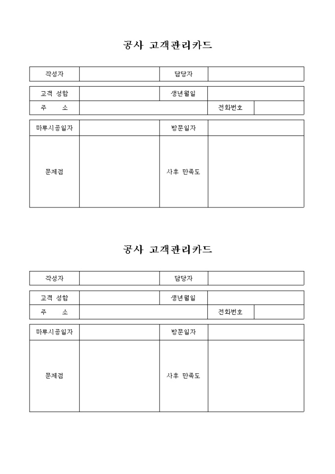 9,000원/월고객인적사항, 공사일자, 공사후 문제점 및 사후 만족도를 표시하는 공사 고객관리카드입니다.
