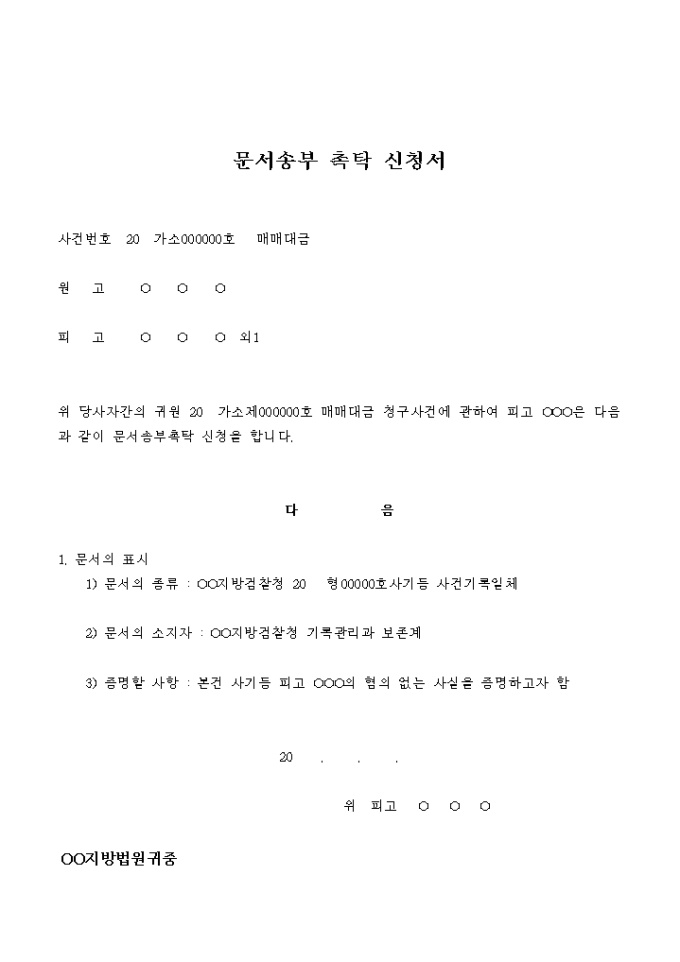 9,000원/월매매대금 청구 소송을 위한 문서송부 촉탁 신청서입니다.