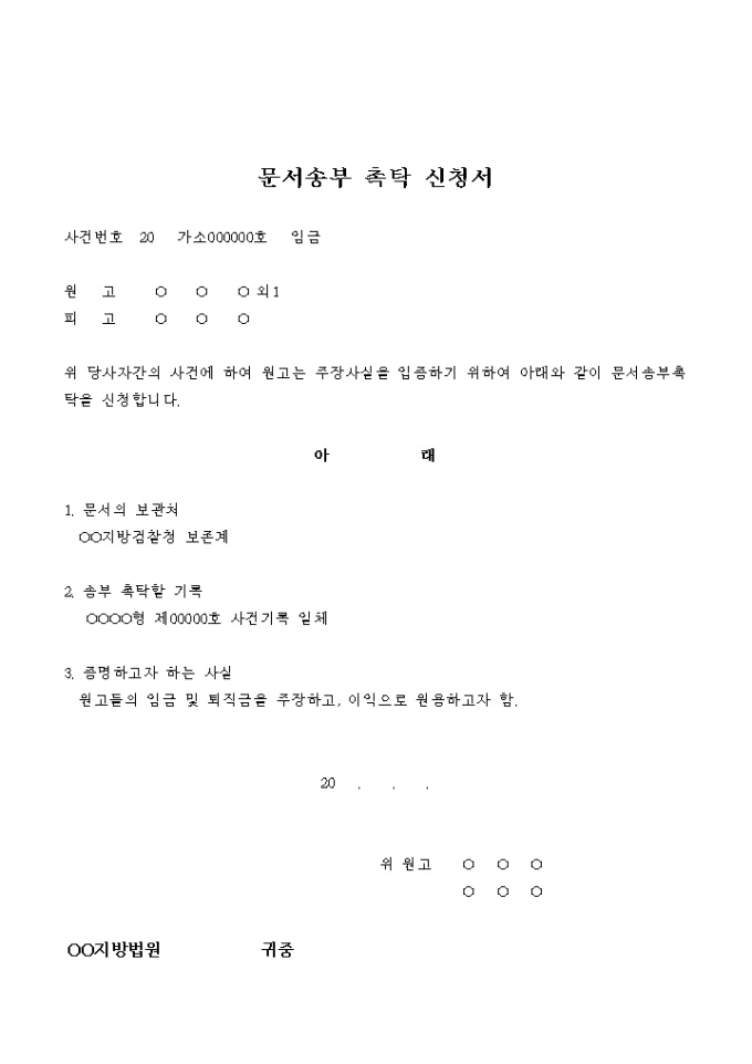 9,000원/월임금 청구소송을 준비하기 위해 관련 문서의 송부를 촉탁하는 신청서입니다.