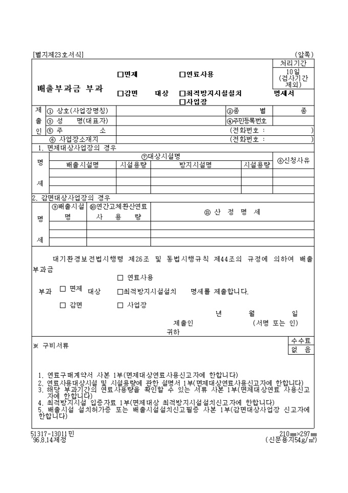 9,000원/월대기환경보전법시행령 제26조 및 동법시행규칙 제44조의 규정에 의하여 배출부과금 부고 (면제,감면)대상 (연료사용, 최적방지 시설 설치, 사업장)명세서를 제출할 때 사용하는 "배출 부과금 부과 (면제,감면)대상 (연료사용, 최적방지 시설설치,사업장) 명세서" 양식입니다.