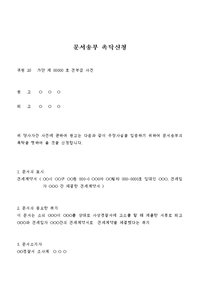 9,000원/월전부금 청구 소송을 준비하기 위해 관련문서의 송부를 촉탁하는 신청서입니다.