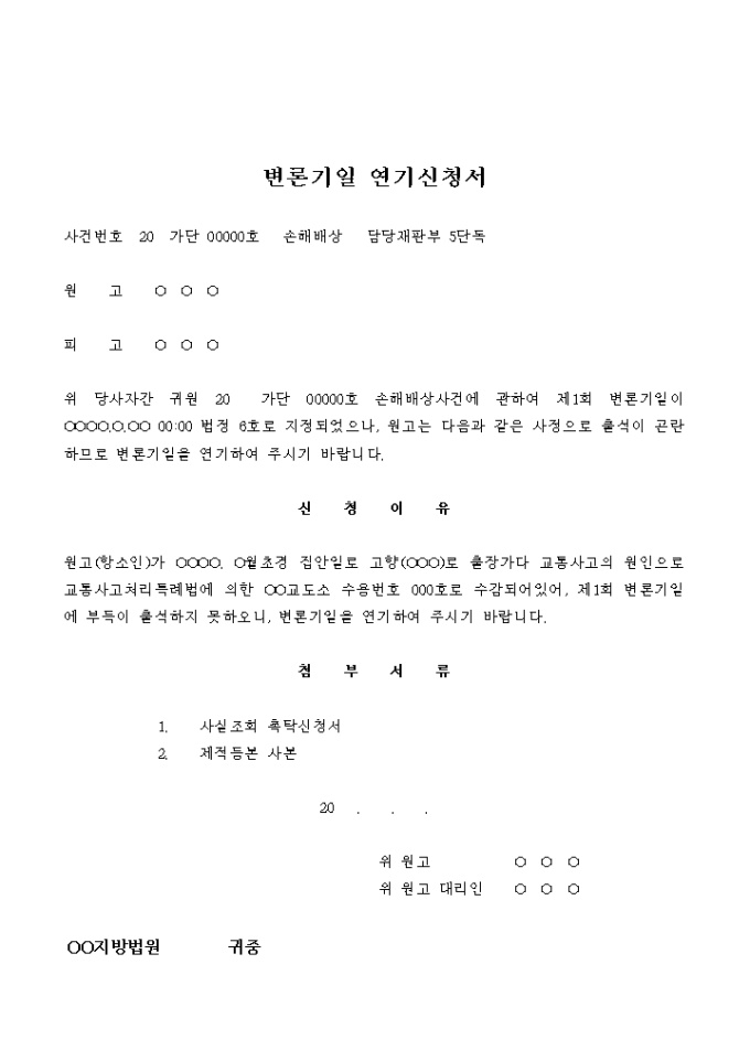 변론기일 연기 신청서(손해배상건)