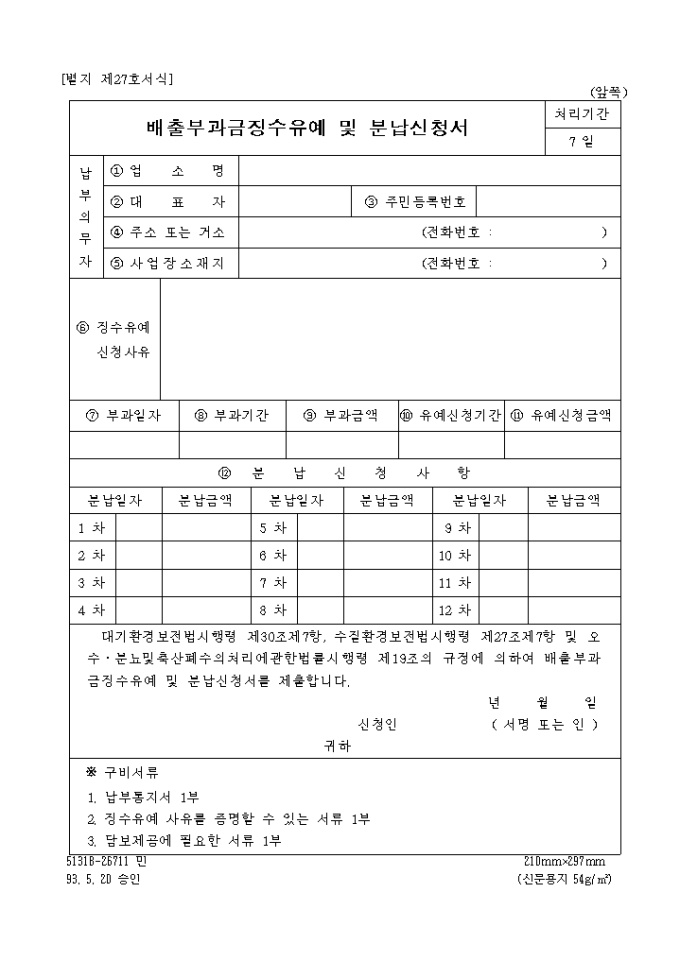 배출부과금징수유예 및 분납신청서