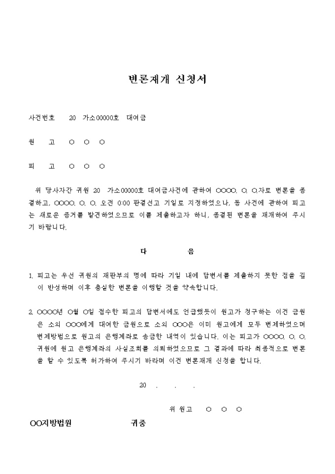 9,000원/월대여금 청구소송의 변론재개 신청서입니다.