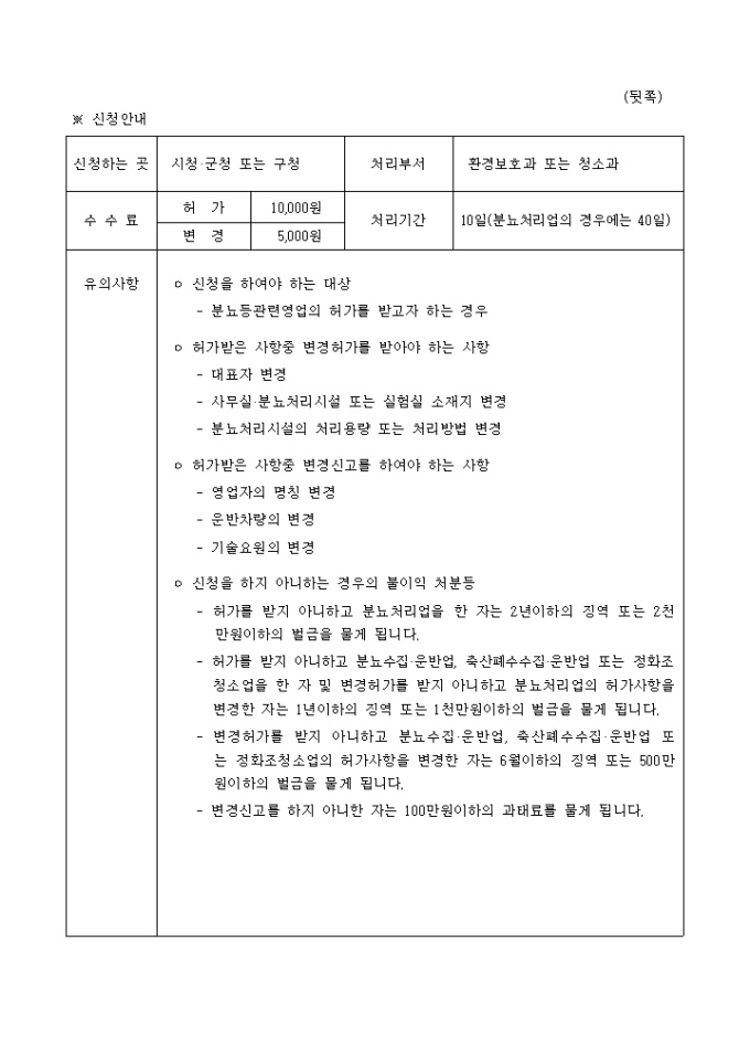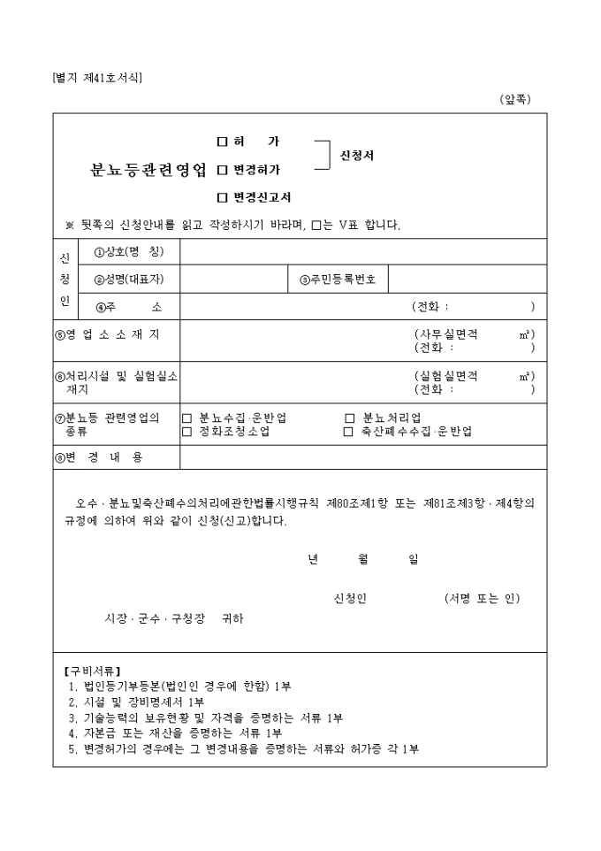 분뇨등 관련영업(허가, 변경허가, 변경신고서)신청서