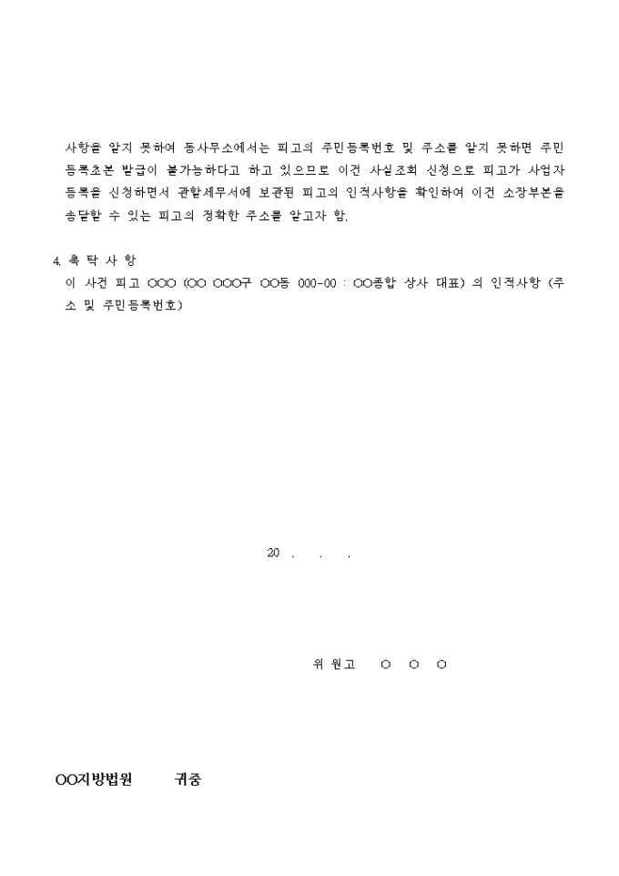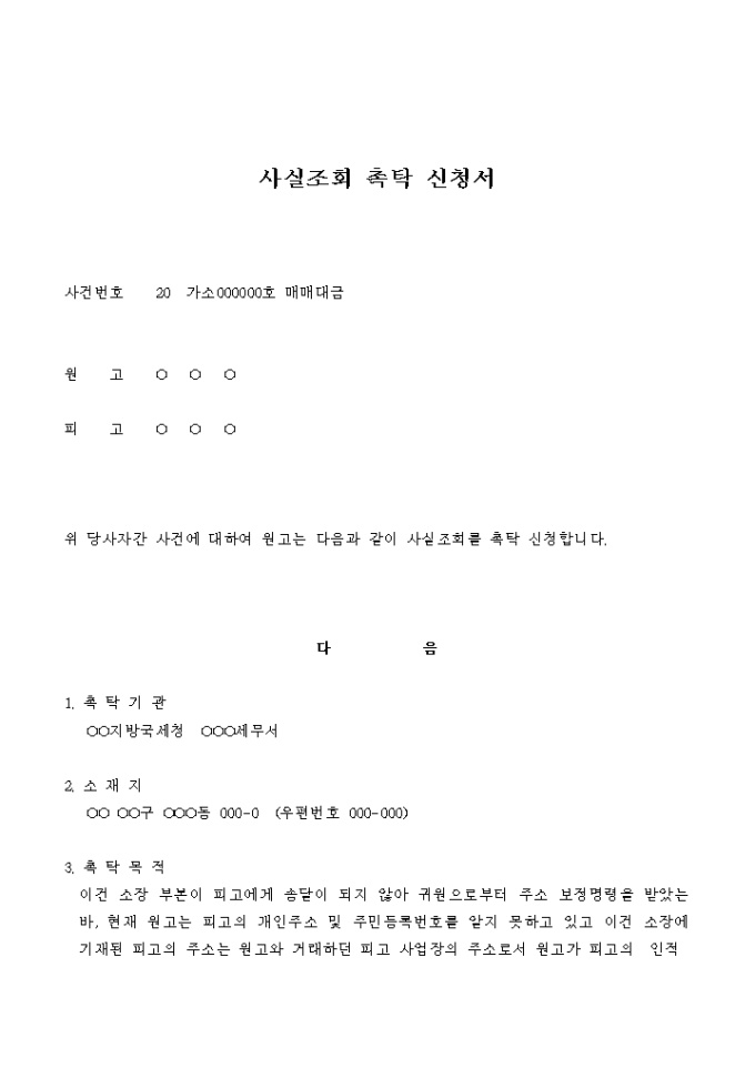 매매대금 청구소송을 위해 피고의 인적사실 조회를 촉탁하는 신청서입니다.