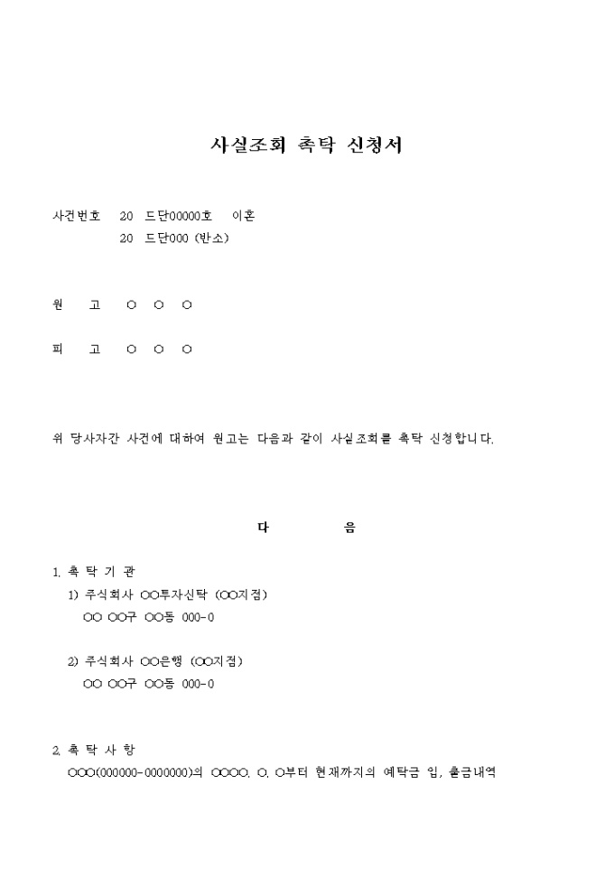 사실조회 촉탁 신청서(이혼_예금의 지급과 사용출처의 확인)