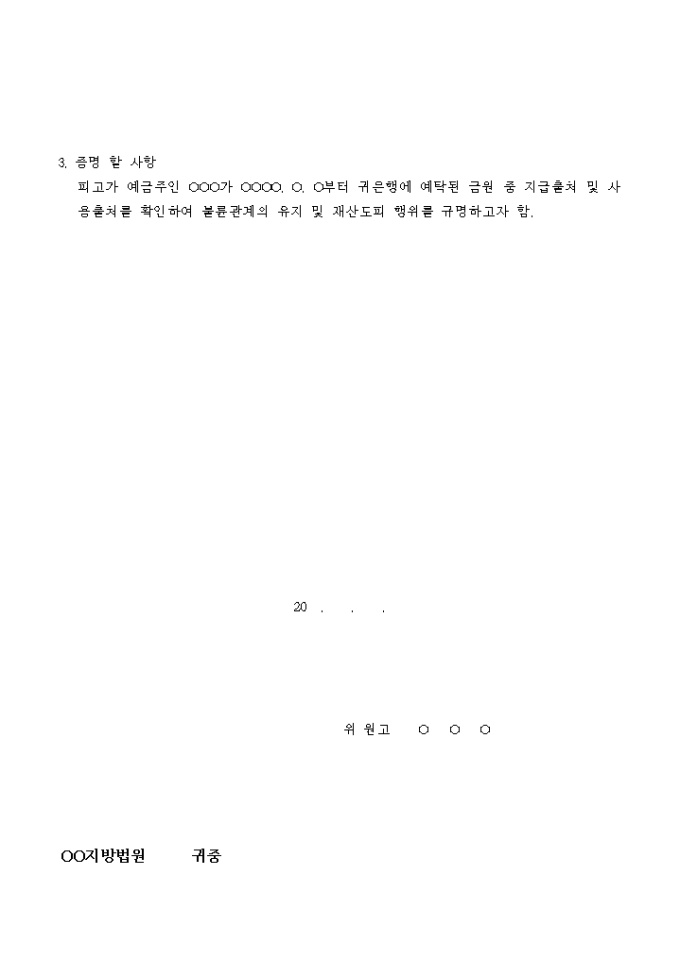 이혼소송을 위해 예금의 지급과 사용출처 조회를 촉탁하는 신청서입니다.