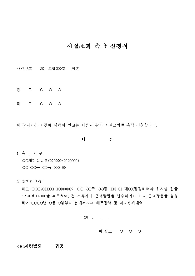 9,000원/월이혼소송을 위해 채무변제 사실의 조회를 촉탁하는 신청서입니다.