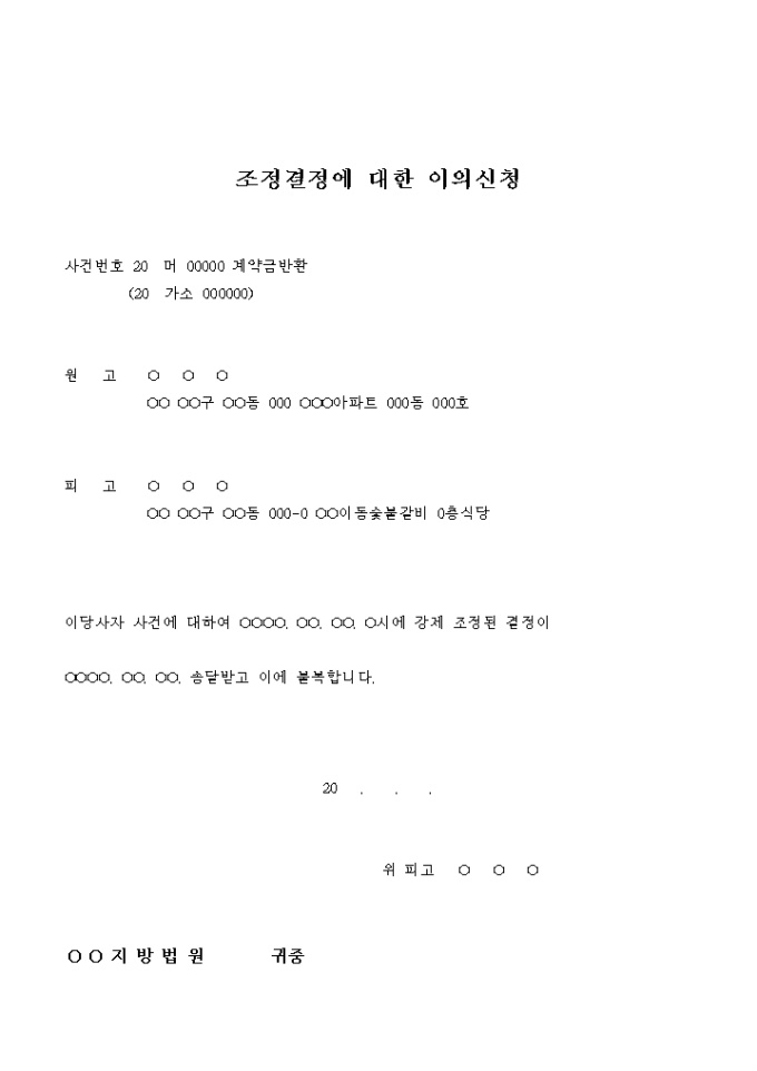 9,000원/월계약금의 반환을 구하는 조정결정에 대한 이의신청서입니다.