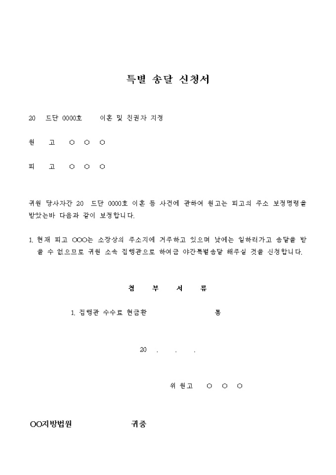 9,000원/월이혼 및 친권자지정 청구사건의 피고가 낮에는 부재중임을 이유로 특별 송달을 신청하는 서식입니다.