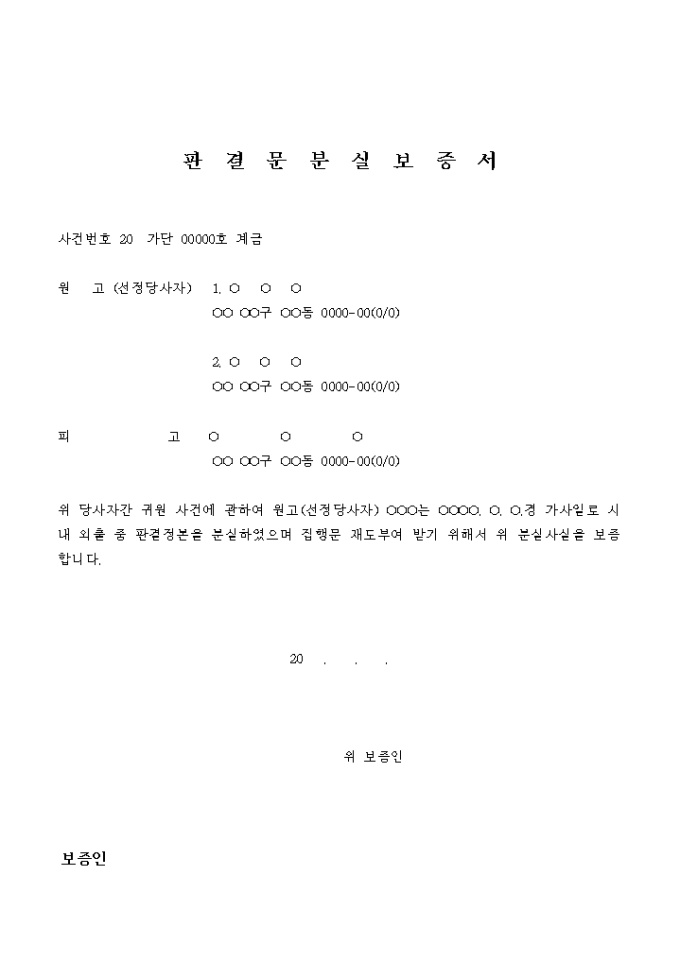 9,000원/월판결정본의 분실로 집행문을 재도부여 받기 위해 판결문 분실을 보증하는 서식입니다.