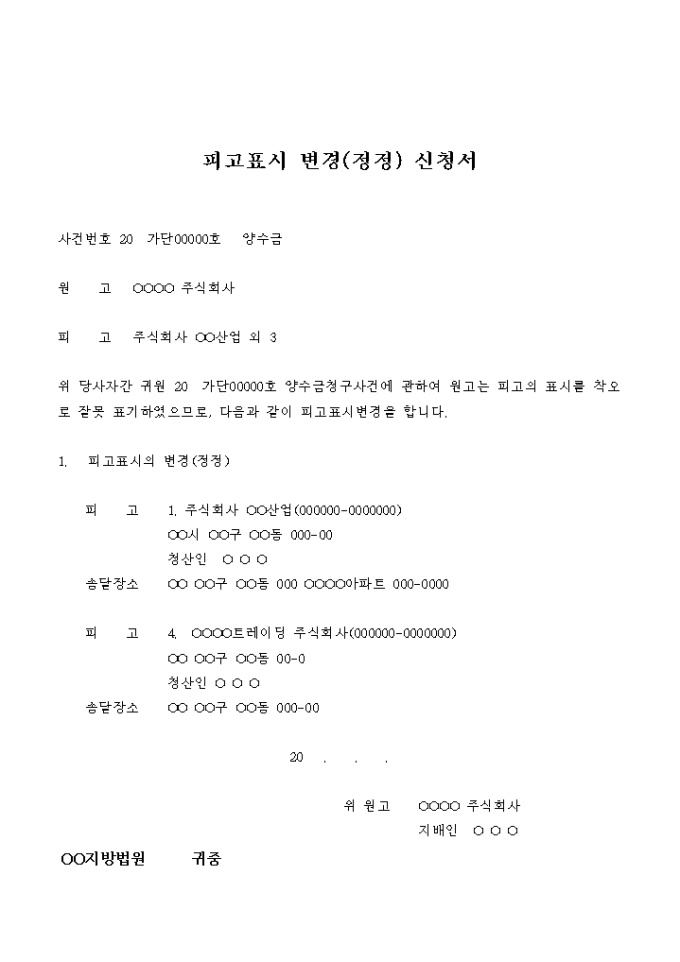 9,000원/월양수금 청구소송의 피고표시 변경(정정) 신청서입니다.