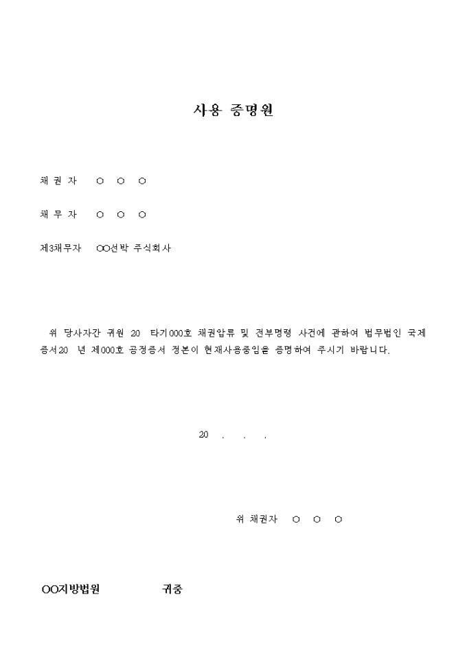 채권압류 및 전부명령에 공정증서를 사용중임을 증명하는 서식입니다.