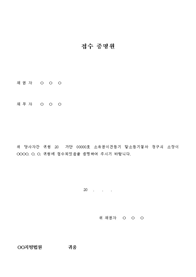 9,000원/월소유권이전등기의 말소등기를 청구하는 신청서가 접수되었음을 증명하는 서식입니다.