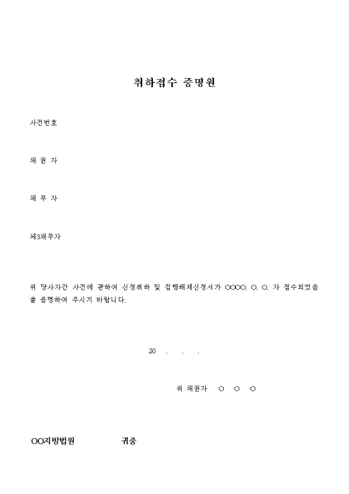 당사자간의 사건에 대하여 취하 및 집행해제를 요구하는 신청서를 접수하였음을 증명하는 기본양식입니다.