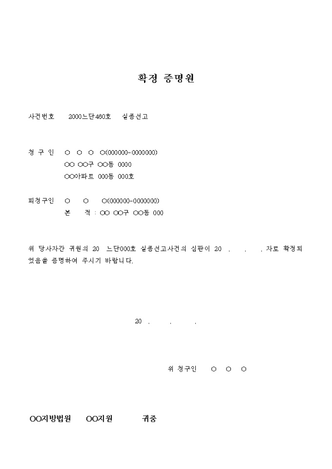 9,000원/월실종선고사건의 심판이 확정되었음을 증명하는 서식입니다.