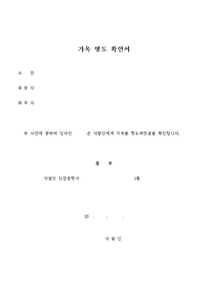건물의 임차인이 경매 낙찰인에게 가옥을 명도(인도)하였음을 확인하는 확인서입니다.