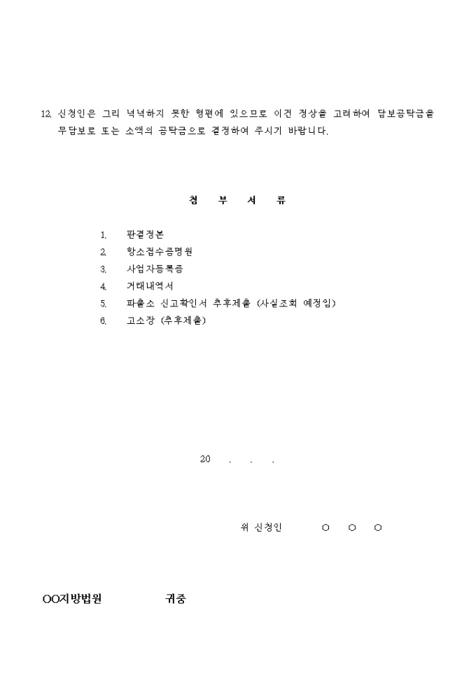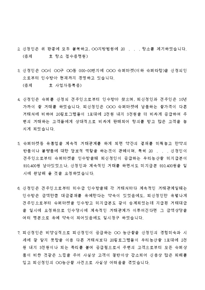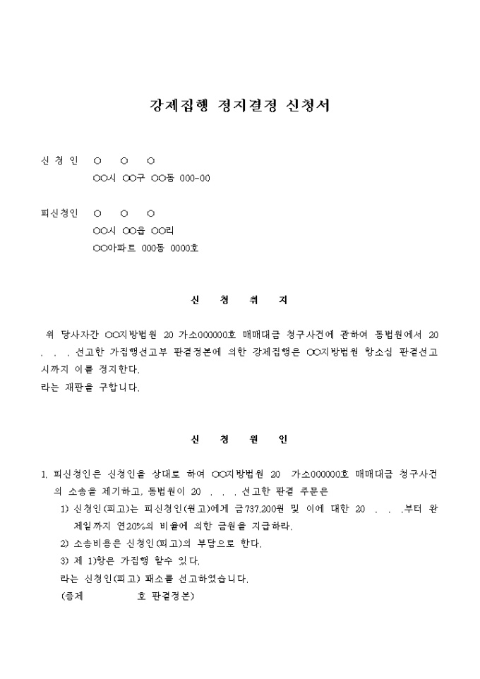 9,000원/월매매대금 청구사건을 원인으로 하는 강제집행의 정지결정을 구하는 신청서입니다.